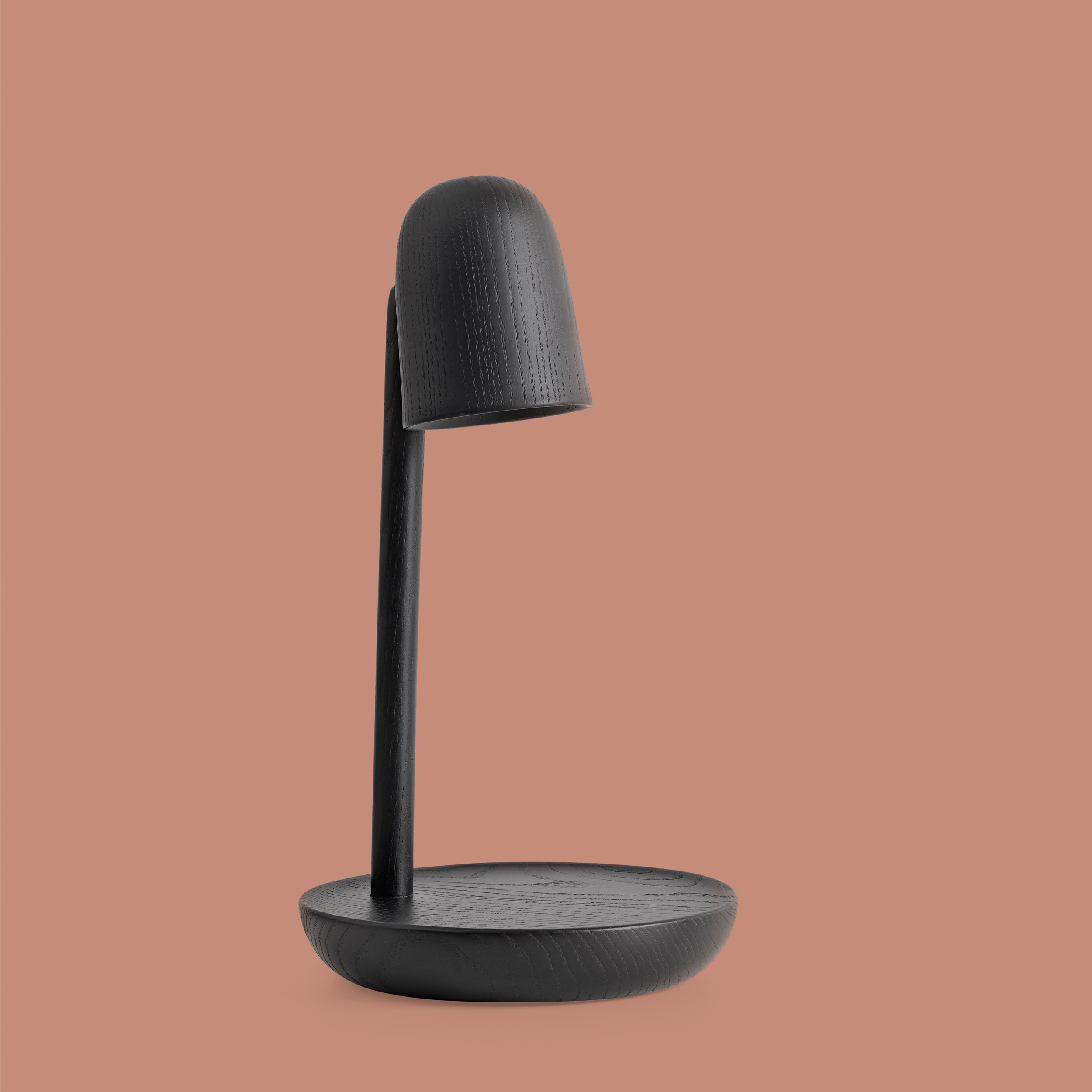 Der Lampenkörper aus hochwertigem Eschenholz wird auf traditionelle Weise gedrechselt und anschließend in tiefem Schwarz lackiert. Dabei bleibt die feine Struktur des Holzes sichtbar – ein faszinierendes Spiel zwischen mattem Lack und warmer Holzmaserung, das jedem Raum Charakter verleiht.