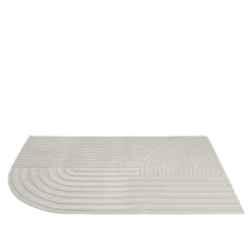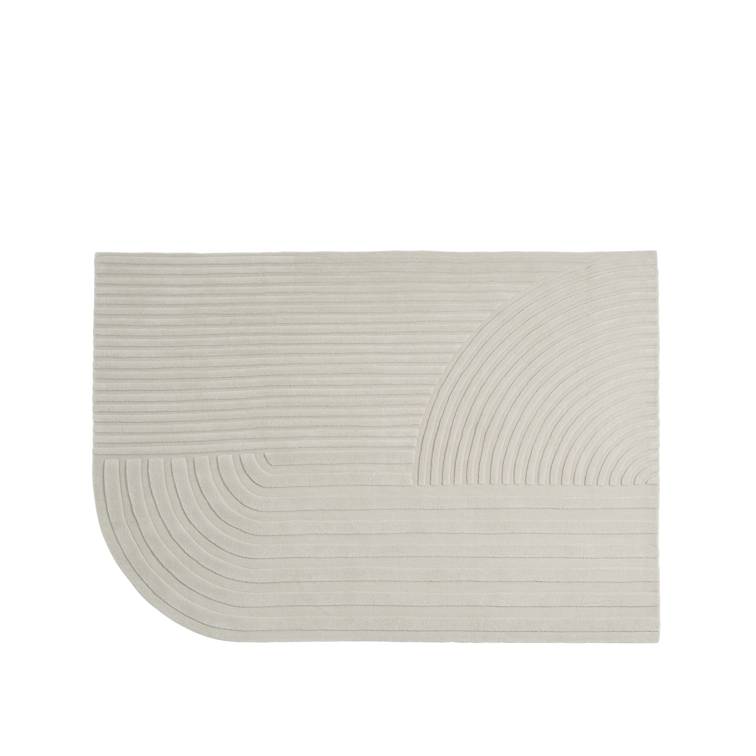 Das grafische Muster entsteht durch unterschiedlich hohe Florzonen, die ein faszinierendes Spiel aus Licht und Schatten erzeugen. So wirkt der Teppich beinahe zweifarbig, obwohl er in einem edlen Cremeweiß gehalten ist. Ein sanft abgerundetes Eck bricht bewusst die klare rechteckige Form und verleiht dem Design eine subtile Spannung – ein stilvolles Statement Piece für jede Einrichtung.